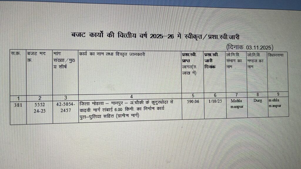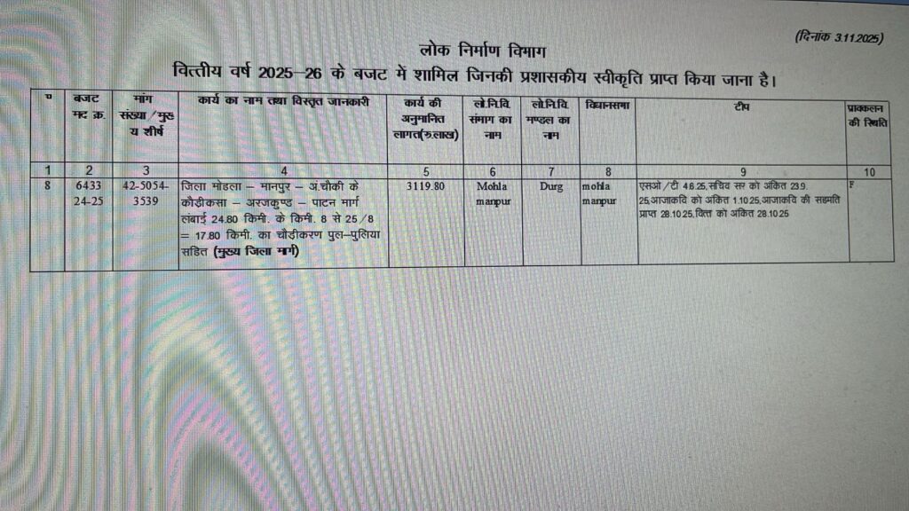 लम्बाई 24.80 किमी के 8′ से 25/8 = 17-80 किमी़चौड़ीकरण पुल पुलिया सहित निर्माण करने हेतु स्वीकृति वित्त विभाग द्वारा प्रदान की गई है। और शीघ्र ही लोक निर्माण विभाग द्वारा टेन्डर की कार्यवाही की जायेगी। सड़क निर्माण होने से आवागमन आसान होगा। अनुमानित लागर रु , 31 करोड़ .19लाख है। जिला पंचायत सदस्य सविता तिलक सोरी को अवगत कराया गया। स्वीकृति के लिए माननीय मुख्यमंत्री, लोक निर्माण विभाग, उपमुख्यमंत्री व वित्त मंत्री का धन्यवाद।