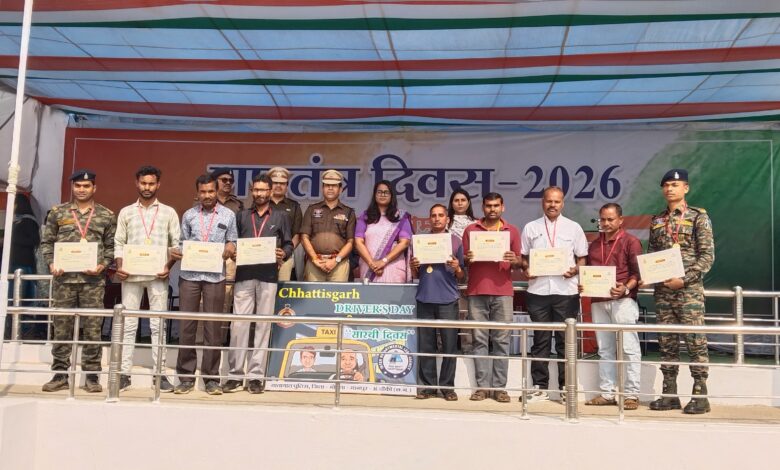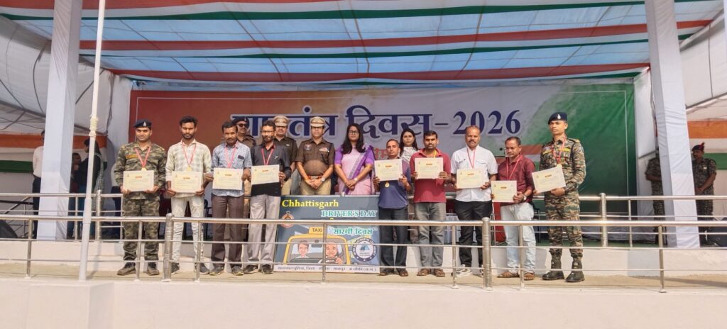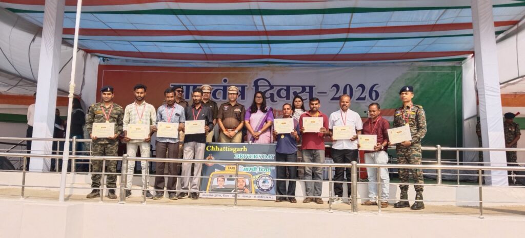राष्ट्रीय सड़क सुरक्षा माह 2026 के अंतर्गत आज मोहला के परेड मैदान में ड्राइवर्स डे (सारथी दिवस) का आयोजन किया गया। कार्यक्रम में कलेक्टर श्रीमती तुलिका प्रजापति एवं पुलिस अधीक्षक श्री वाय.पी. सिंह (भा.पु.से.) द्वारा सुरक्षित एवं बिना नशे के वाहन संचालन करने वाले स्कूल बस, ऑटो रिक्शा व बसों के 9 चालकों को मेडल एवं प्रमाणपत्र देकर सम्मानित किया गया।