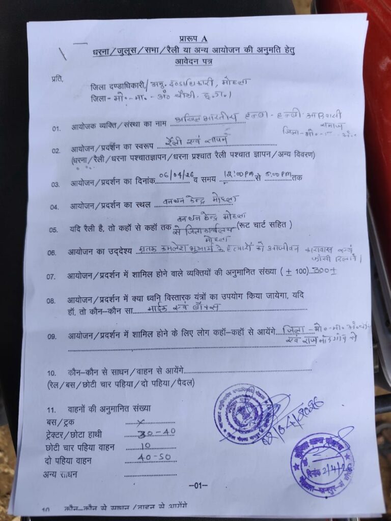 मोहला में रैली एवं धरना आयोजन 6अप्रेलहेतु अनुमति के लिये आवेदन प्रस्तुत