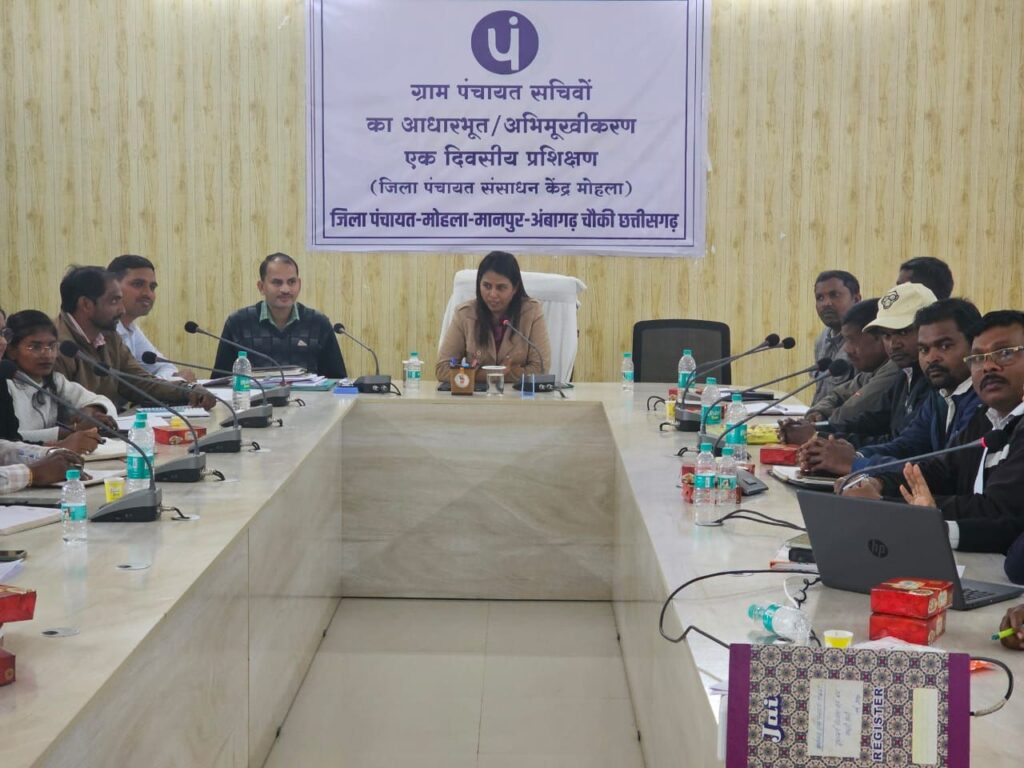 मोहला 9 जनवरी 2026। राष्ट्रीय ग्राम स्वराज अभियान (RGSA) अंतर्गत जिला मोहला-मानपुर-अंबागढ़ चौकी के जिला पंचायत संसाधन केंद्र में ग्राम पंचायत सचिवों हेतु आधारभूत एवं अभिमुखीकरण प्रशिक्षण का आयोजन किया गया। यह प्रशिक्षण जिले के तीनों जनपद पंचायतों में चरणबद्ध रूप से संपन्न हुआ। प्रशिक्षण कार्यक्रम के तहत 05 जनवरी 2026 को जनपद पंचायत मोहला, 06 जनवरी 2026 को जनपद पंचायत मानपुर तथा 08 जनवरी 2026 को जनपद पंचायत अंबागढ़ चौकी के ग्राम पंचायत सचिवों को प्रशिक्षण प्रदान किया गया। यह