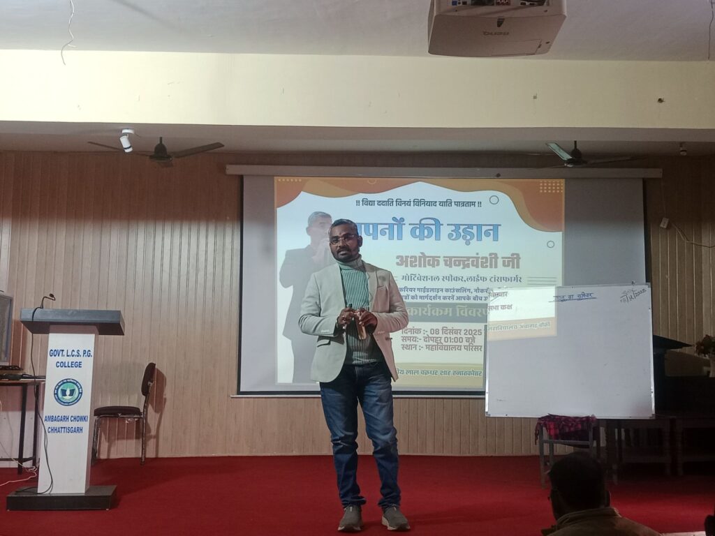 अंबागढ़ चौकी। शासकीय लाल चक्रधर शाह स्नातकोत्तर महाविद्यालय में छात्रों के भविष्य निर्माण हेतु करियर गाइडेंस एवं काउंसलिंग कार्यक्रम का सफल आयोजन किया गया। कार्यक्रम में मुख्य वक्ता के रूप में श्री अशोक चन्द्रवंशी जी ने उपस्थित होकर छात्रों को करियर गाइडेंस, काउंसलिंग, नौकरी, प्रतियोगी परीक्षा एवं कौशल विकास जैसे महत्वपूर्ण विषयों पर विस्तृत मार्गदर्शन प्रदान किया।
