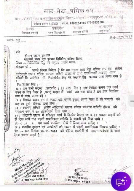 प्राप्त जानकारी के अनुसार, ‘लाट मेटा श्रमिक संघ’ (पंजीयन क्रमांक 116392) के नाम पर क्षेत्रीय कांग्रेस विधायक प्रतिनिधि बालचंद कोरेटी तथा कांग्रेस के कुछ प्रमुख पदाधिकारियों ने सुनियोजित तरीके से एक संगठन तैयार किया है। इन्होंने गोदावरी माइंस में उत्पादित स्पंज आयरन को रायपुर (सिलतरा) तक परिवहन करने का 50% ठेका लिया है। स्वयं के ट्रक न होने के बावजूद, अन्य जिलों के ट्रकों को प्राथमिकता देते हुए अनुचित तथा अवैध ढंग से परिवहन कार्य अबाध गति से किया जा रहा है।