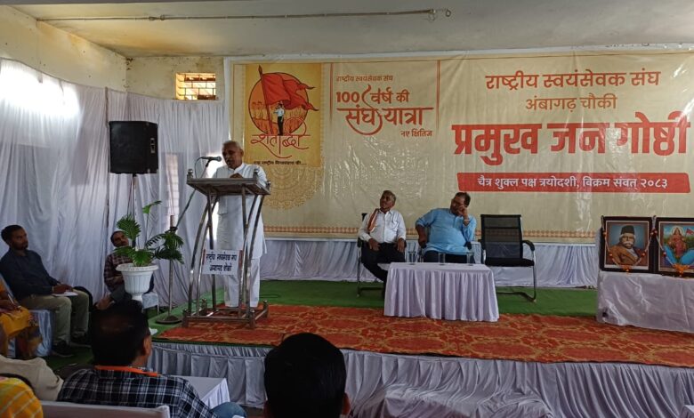 अंबागढ़ चौकी में आयोजित प्रमुख जन गोष्ठी में मुख्य वक्ता संघ के मध्य क्षेत्र प्रचारक प्रमुख शिवराम समदरिया ने संघ के स्थापना काल से लेकर शताब्दी वर्ष तक के विभिन्न कालखंडों और उसके उतार चढ़ाव को बताते हुए कहा कि, संघ ने शुरूआती 25 वर्ष अपने सबसे बुरे समय को देखा फिर निरंतर संघ के प्रति समाज की भावना सकारात्मक होती रही यही कारण है कि, संघ आज अपना गौरवशाली सौ वर्ष पूर्ण कर समाज और राष्ट्र की सेवा में रत है। उन्होंने कहा कि शताब्दी वर्ष में संघ को अच्छा मानने वालों से संघ को अपना मानने का कार्य करना है। श्री समदरिया ने कहा कि, संघ सभी को रोटी कपड़ा और मकान के साथ शिक्षा और स्वास्थ्य की सुविधा समाज के अंतिम व्यक्ति तक पहुंचे के मूल उद्देश्य को लेकर कार्य कर रहा है। उन्होंने कृषि, शिक्षा सहित समाज के विभिन्न क्षेत्रों में नवाचार की आवश्यकता पर जोर देते हुए संघ के पंच परिवर्तन के विषयों को विस्तार से बताया। श्री समदरिया ने अपने उद्बोधन में रामायण के विभिन्न प्रसंगों के माध्यम से संत मिलन, हरिकथा, दया , धर्म और उपकार को आज सबसे बड़ी सामाजिक जरूरत बताया ।