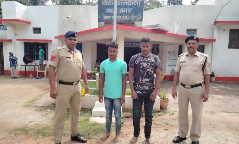 प्रकरण की विवेचना दौरान थाना सिटी कोतवाली जशपुर को मुखबिर से सूचना मिला की दो व्यक्ति शहर के नजदीक गिरांग जंगल में मोटरसाइकिल को छुपाने का प्रयास कर रहे हैं इस सूचना पर तत्काल थाना से पुलिस टीम मौके पर जाकर दबिश देकर घेराबंदी कर मोटरसाइकिल छुपा रहे आरोपियों को अभिरक्षा में लेकर थाना लाया गया। पूछताछ में आरोपियों ने उक्त मोटरसाइकिल को प्रार्थी के निवास के पास से चोरी करना बताया। *आरोपीगण 1- रियाज अंसारी उम्र 26 साल निवासी जोरी जिला लोहरदगा एवं 2-प्रदीप कुमार महतो उम्र 20 साल निवासी नंदतिलो थाना कुडू जिला लोहरदगा* को दिनांक 04.09.2022 को गिरफ्तार कर न्यायिक अभिरक्षा में भेजा गया है।