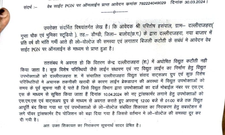 दल्ली राजहरा , नगर भर में छत्तीसगढ़ स्टेट पावर सप्लाई लिमिटेड द्वारा किये जाने वाले विद्युत आपूर्ति में होने वाले अघोषित कटौती और लो वोल्टेज के संबंध में युवा कांग्रेस नगर अध्यक्ष परितोष हंसपाल द्वारा जनदर्शन में किया गया शिकायत ।