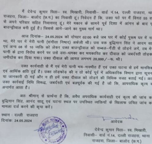 दल्लीराजहरा नगरपालिका अध्यक्ष के ऊपर लगे गंभीर आरोप बिना नोटिस व सूचना दिए अवैध बताते हुए वार्ड 14 निवासी देवेंद्र यादव के बाउंड्रीवॉल को बलपूर्वक तोड़वाया गया।