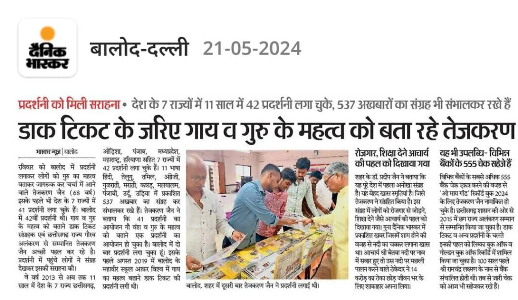 । तेजकरण जैन कोई अनजाना नाम नहीं है। छत्तीसगढ़ राज्य अलंकरण, ग्रैंडमास्टर बुद्ध का इंडियन फिलेटसी, भगवान गौतम फैलोशिप को हासिल करने वाले श्री जैन ने गाय एवं गुरु के महत्व को लेकर अपना व्यक्तिगत अभियान के जरिये अपनी पहचान बनाई। अब जैन को सूरत में प्रशम मूर्ति अजीतसागर ससंघ पावन निश्रा में श्री सकल दिगंबर जैन समाज, अविजित समूह सूरत द्वारा आचार्य विद्यासागर पत्रकारिता पुरस्कार से सम्मानित किया जाएगा।