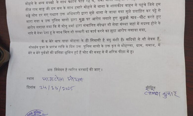 जबरन प्रताड़ित करने और मार-पीट करने की शिकायत पुलिस अधीक्षक कार्यालय मे दर्ज। लोमेश कुमार यादव पिता स्वः दिलीप उम्र 19 वर्ष वार्ड न. 14 ग्राम मोहला, थाना मोहला, जिला मोहला-मानपुर-अं.चौकी (छ.ग.) का निवासी है। यह कि दिनांक 21.10.25 को रात्रि 8.30 से 9.00 बजे के बीच में अपने निवास में गोर्वधन पूजा के अवसर पर वार्ड के अन्य बच्चो…
