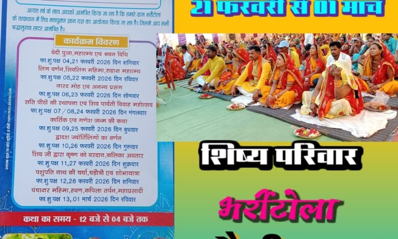 भर्राटोला में 21 फरवरी से शिव महापुराण ज्ञान यज्ञ का शुभारंभभर्राटोला (कौड़ीकसा) में 21 फरवरी 2026 से शिव महापुराण ज्ञान यज्ञ का भव्य आयोजन किया जा रहा है। ग्राम भर्राटोला के तत्वाधान में आयोजित इस धार्मिक अनुष्ठान में सभी श्रद्धालुओं को सादर आमंत्रित किया गया है। कथा प्रतिदिन दोपहर 12 बजे से शाम 4 बजे तक होगी।प्रवचनकर्ता के रूप में…
